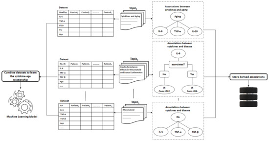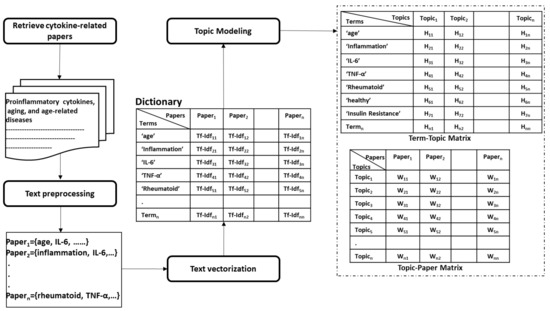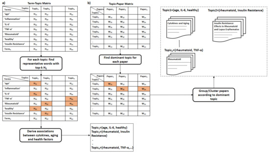 - Clustering of papers according to topic. We apply unsupervised clustering on topic-paper matrix, as illustrated in Figure 5b. Alternatively, we can assign each paper to the topic with the highest relevance score in W. Then, we group papers by the dominant topic. Semantic validation of the topics modeled should be performed by experts.Steps 5 and 6 are equivalent to the post-processing step proposed by Asmussen et al. [112]. As an output of this step, we expect that more than one disease to belong to the same topic in case of co-morbidities, such as Rheumatoid and insulin resistance.Various evaluation strategies can be followed to validate the topics modeled. One way is to validate them by experts semantically. Another way would be through evaluating the topics at the term level. Terms belonging to the same topic are supposed to be more similar to each other than to term in a different topic [113]. Therefore, the similarity scores between the two representative terms within the same topic should be smaller than the similarity scores to terms of a different topic. As each term is represented as a vector of coefficients in the term-topic matrix, we can use any similarity measure, such as cosine similarity or euclidean distance.Zhang et al. validated the derived disease-gene associations by topic modeling with annotated disease-gene associations by the Online Mendelian Inheritance in Man (OMIM) knowledge base [113]. Similarly, we can validate the proposed method by computing the overlapping proportion between the extracted disease/aging-cytokine associations and the manually derived associations in Section 5.