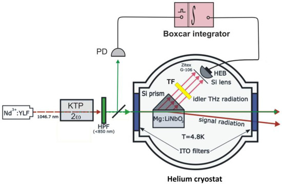 The schematics of our experimental setup are shown in Figure 1. Second harmonic of diode-pumped Nd3+:YLF solid-state laser, generated in KTP crystal (2ω), was used to pump Mg:LiNbO3 crystal with 7.1 mol.% Mg content (LN). The pump wavelength was 523.35 nm, the pump pulse duration and repetition frequency were 10 ns and 7 kHz, correspondingly, and the pump beam waist at the crystal was ~100 μm. The crystal was mounted in He cryostat together with superconducting HEB manufactured by company SCONTEL, Russia [32]. Temperatures of the crystal and the bolometer sensitive NbN element were kept at the same value: 4.8 K. According to data provided by manufacturers, the characteristic response time and noise equivalent power of the bolometer were 50 ps and , respectively. A special planar logarithmic spiral antenna [33] was optimized for the spectral range 0.1–6 THz. The cryostat windows of 20 mm diameter, designed to enter the pump radiation into the cooled chamber and to extract it out after passing the crystal, were equipped with ITO filters [34]. The bolometer was inside three shielding shells of the cryostat. Glass windows were installed on an external aluminum shell that was kept at room temperature. The next shell from a stainless steel was provided by open windows. Finally, a third brass shell was in contact with the cooled board. The ITO filters were installed into the windows in the third shell, and the bolometer sensitive element was attached to the board. All cryostat compartments were pumped out to a pressure of 10−6 mbar. By this arrangement, the temperature of both ITO filters practically coincided with the temperature of the bolometer, and these cooled filters prevented outside thermal radiation at THz frequencies from entering the cryostat [5]. At the same time, not only direct pumping beam, but also optical radiation of Stokes and anti-Stokes frequencies, generated in LN at small angles, could leave the cryostat without any significant absorption [11]. In addition, IR filter (ZitexRG-106) protected the bolometer from pump radiation elastically scattered within the crystal.