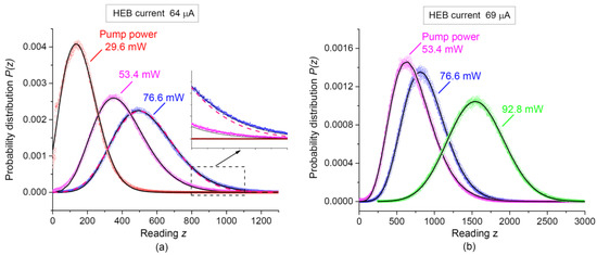 Examples of area-normalized histograms of the bolometer short-time readings, recorded under different laser pump powers, are shown in Figure 2 by circles. The bolometer operated at two different initial transport currents through NbN film, 64 μA (Figure 2a), or 69 μA (Figure 2b). The HEB settings, as well as all parameters of PDC apart from pump power, were kept constant within each series of histograms.