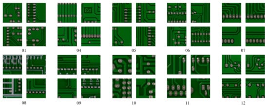 Huang and Wei created a dataset for PCB defects [12]. To verify our PCB defect detection method, we applied their open PCB defect dataset to our experiment. Ten reference PCBs were selected to create this dataset, each of which was captured by a 16-megapixel HD industrial camera equipped with a CMOS sensor. The resolution of the original image was pixels and was adjusted according to the size of each PCB. The reference PCB images are presented in Figure 1.