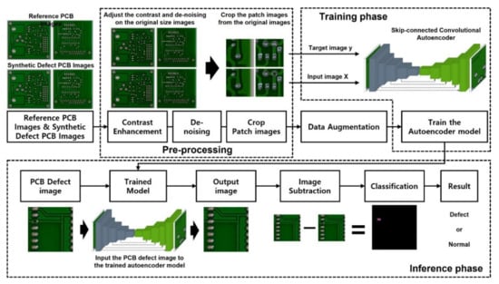 The pipeline of the entire PCB defect detection system proposed in this study is shown in Figure 3. In the preprocessing step, the original PCB dataset is processed by image contrast enhancement and noise rejection to improve the image quality. In the last step of the preprocessing, the PCB images are segmented into patch images of size pixels, and these patch images including the defects are grouped separately for data augmentation. In the data augmentation block, defect patch data are augmented by random rotation, random flip, and random Gaussian to overcome the limitation resulting from a lack of data and an imbalance of data classes. Then, the augmented patch images, including the defects, are used to train the skip-connected convolutional autoencoder models [2] to predict the non-defect patch images of the input. Once the trained model predicts a high-quality PCB image from the defective PCB images, the defect detection map is generated by subtracting the infrared image from the defective input image. Critical defects can be highlighted by applying the appropriate threshold to the detection map images.