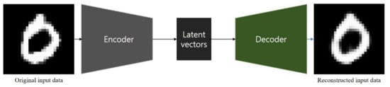 An autoencoder is a network that aims to encode an input to a low-dimensional latent space and then decode it [17]. It is an unsupervised learning algorithm that allows the extraction of generally useful features from unlabeled data [18]. As shown in Figure 4, an autoencoder consists of two parts: an encoder, which transforms the input data into low-dimensional latent vectors, and a decoder, which expands the latent vectors to reproduce the original input data. They are commonly used for data compression [19,20], denoising [21,22,23], and anomaly detection [24,25,26,27].