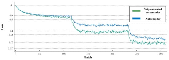 To train the models, we applied data augmentation to the dataset. The augmented dataset consisted of 98,730 patch images, and each patch image was paired with a reference normal patch image. We followed the training hyperparameter settings in [34], as listed in Table 4. The initial learning rate was 0.1, which was divided by 5 at 60, 120, and 160 epochs; the weight decay was 5 × 10−4; and the Nesterov momentum was 0.9. The total number of training epochs was 300 with a batch size of 128. Figure 6 shows the training losses of the two networks. As shown in the figure, the training losses decrease rapidly according to the learning rate schedule and the training loss of the skip-connected convolutional autoencoder is slightly lower than that of the autoencoder. As we mentioned above, the lower training loss in the skip-connected autoencoder is because skip connections solve the degradation problem so that it can converge to a better optimum.