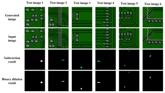 Results from the six test images. The subtraction result is the difference between the generated image and the input image. The binary dilation result is an image whose noise is removed by using the dilation technique.