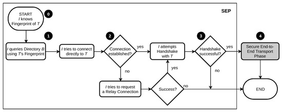 Schematic flow chart of the process of connection establishment of a secure end-to-end channel within the SEP suite.