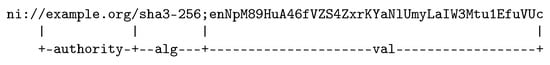 - Farrell, S.; Kutscher, D.; Dannewitz, C.; Ohlman, B.; Keranen, A.; Hallam-Baker, P. Naming Things with Hashes. RFC 6920, Internet Engineering Task Force (IETF). 2013. Available online: https://datatracker.ietf.org/doc/html/rfc6920 (accessed on 18 July 2021).