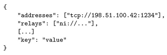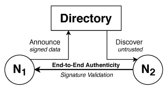 In our reference implementation, we use client certificate authentication in the TLS handshake between the node and the directory using the public key of the announcing node. The directory server subsequently computes the node’s fingerprint from the public key of the TLS client certificate and verifies the signature of the record set. Transfer of the record set is technically realized as a HTTP PUT request carrying a JavaScript Object Notation (JSON)-based payload. The entire record set is then inserted into a database using the connecting node’s fingerprint as the lookup key.