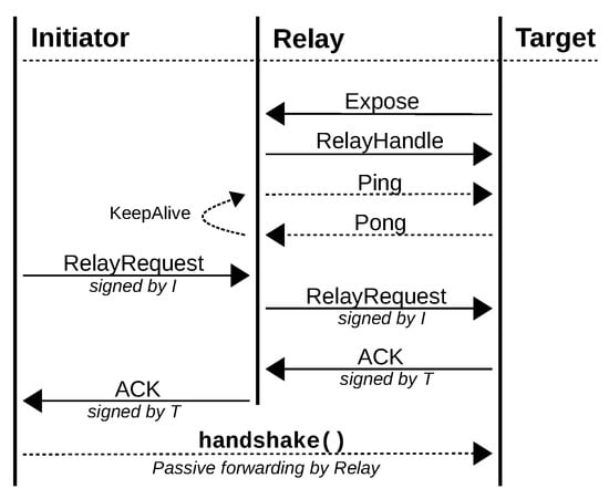 - If the initiator is not able to establish a direct network connection, a relay is optionally utilized to reach the target. From the perspective of node I, trust towards the relay is inherited from the target due to the signature of the record set. From the relay’s perspective, trust has to be earned by the approval of the relay request by node T. If this succeeds, the relay starts with passively forwarding network traffic, allowing the initiator to attempt a handshake with the target.