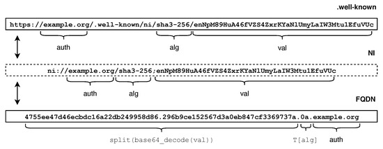 According to the ni standard, a fingerprint consists of four pieces of information: the scheme (ni://), the authority (), the applied hash algorithm (), and the value in base64 encoding (). The scheme is not used in the FQDN format and can be dropped. While the part is kept unmodified, the and the part need to be transformed to subdomain labels to be compatible to DNS names.