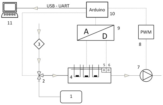 The diagram of the test equipment constructed for the sensor analysis is shown in Figure 1. It consisted of the following elements:(1) Tedlar foil bag, (2) three-way valve, (3) air filter, (4) gas sensor array, (5) temperature sensor, (6) humidity sensor, (7) diaphragm pump, (8) pulse width modulation module, (9) analog-to-digital converter, (10) Arduino MEGA2560 platform, (11) computer. A stream of clean air flowed through the measuring chamber at a constant flow rate, controlled by the diaphragm pump rotation speed. The change in the pump rotation is caused by a change in the DC voltage supplied to the pump motor. The PWM module (8) controlled by Arduino (10) is responsible for the regulation of the supply voltage. By changing the position of a three-way valve (2), a sample of the prepared gas mixture was directed to the measuring chamber. After completion of the measurement, clean air was returned to the measuring chamber in order to regenerate the sensors by changing the valve (2) position. Flushing the sensors with clean air made it possible to restore them to their initial parameters and prepare them for subsequent analyzes. The electrical systems for each of the sensors have been prepared in accordance with the manufacturer’s requirements. The signals from the sensors were recorded using an analog-to-digital converter (ADS1015). All data were saved on the computer using dedicated software.