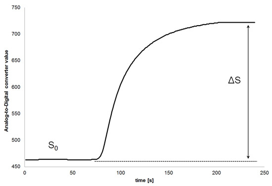 An example of the sensor response is shown in Figure 2. For data analysis, the relative sensor response () was used. It was calculated using the formula: