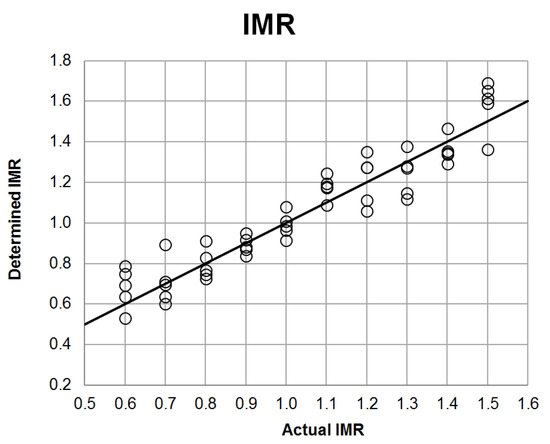 Figure 6 presents the IMR parameter determination using a gas sensor array in the range from 0.6 to 1.5. The Root-Mean-Square Error (RMSE) for the entire range is equal to 0.096. However, in the range 0.9–1.1, where these IMR values are most commonly found in industrial conditions, the RMSE is equal to 0.065.