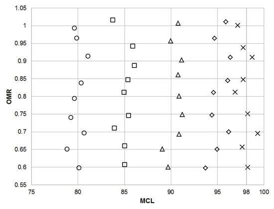 Figure 7 presents the OMR and MCL values determined using a gas sensor array. They were measured using model gas mixtures, the composition of which was represented by the values of parameters equal to the intersections of the gridlines in Figure 7. Model gas mixtures with composition within the range of parameters: OMR 0.6–1.0 (step 0.5) and MCL 80–95% (step 5%) and 98% were used. The RMSE for MCL determination is equal to 0.8%, and for OMR determination, it is equal to 0.008.