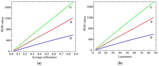 We first evaluated the linearity of the raw camera data. A set of gray chips from the X-rite Color Checker were used as the color target. The surface–spectral reflectance of these samples was measured using a spectral colorimeter (CM-2600d, Konica Minolta, Tokyo, Japan). The mobile phone used was an Apple iPhone 8. Figure 1a shows the relationship between the average reflectance of the gray chips and the camera RGB output. We also calculated the luminance values for the color samples under International Commission on Illumination (CIE) Standard Illuminant D65 using the spectral luminous efficiency curve . Figure 1b shows the relationship between the luminance values and the camera RGB outputs.