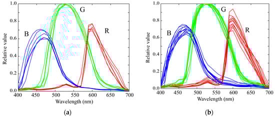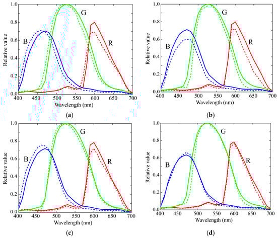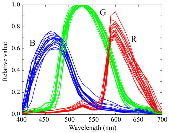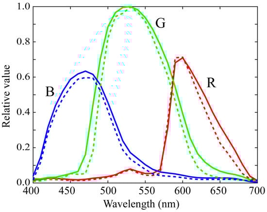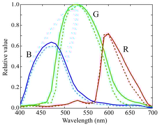 As the first principal component is the same as the average spectrum of the spectral dataset, the PCA of the dataset of the measured spectral sensitivities is not required. The spectral sensitivity functions are estimated by simply weighting the average spectral sensitivity functions. The numerical data of the average spectral sensitivities , , and  are available at the same site (http://ohlab.kic.ac.jp/) (accessed on 22 July 2021) as our database. The three weighting coefficients , , and  are calculated from the camera RGB data for color samples and the estimates of the spectral sensitivity functions are obtained using Equation (31).