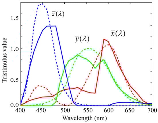 The root-mean-square errors (RMSEs)  of the estimates were calculated, where the symbol  denotes the trace of a matrix . Figure 5 shows the fitting results to the color-matching functions based on the spectral sensitivity functions of the iPhone 8. The RMSE was 0.254. The average RMSE over all the measured sensitivity functions in our database was 0.226. We also calculated the CIE-LAB color difference (Delta-E 1976) under Standard Illuminant D65 for many Munsell color chips. The average color difference was 5.61. Thus, the Luther condition was not completely satisfied.