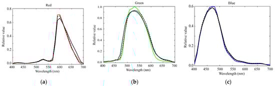 Figure 6 shows the first three principal components , , and  for the (a) red, (b) green, and (c) blue channels of the spectral sensitivity functions where the bold, broken, and dotted curves represent the first, second, and third principal components, respectively. The percent variances are P(1) = 0.9940, P(2) = 0.9974, P(3) = 0.9990 for red, P(1) = 0.9954, P(2) = 0.9984, P(3) = 0.9995 for green, and P(1) = 0.9926, P(2) = 0.9962, P(3) = 0.9999 for blue. The first principal component  is the average spectral curve of the spectral sensitivity function dataset, which plays the most important role in the spectral representation. The results of the PCA suggest that the measured spectral sensitivity functions can be approximated using the first three principal components with sufficient accuracy. The approximation is obtained using the principal component expansion in Equation (10). Figure 7 shows the approximated spectral curves for the (a) red, (b) green, and (c) blue channels of the spectral sensitivity functions of the iPhone 8, where the colored bold curves, the black bold curves, and the broken curves represent the measured spectral sensitivities, the approximation using the first component only, and the approximation using the first two components, respectively.