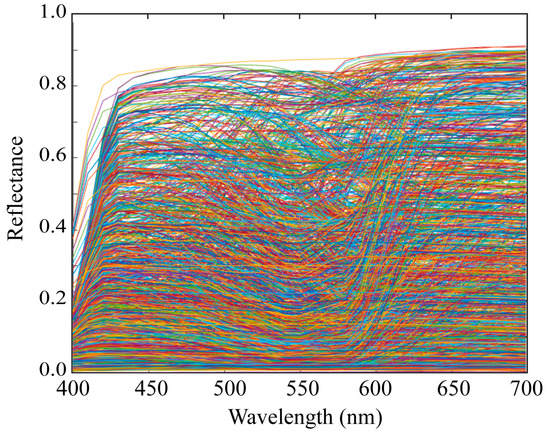 - Shimano, N. Recovery of spectral reflectances of objects being imaged without prior knowledge. IEEE Trans. Image Process. 2006, 15, 1848–1856. [Google Scholar] [CrossRef] [PubMed]