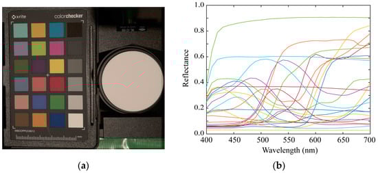 We used 1523 Munsell color chips from the Munsell Book of Color []. The chips are reflective color targets arranged in the Munsell color system. Figure 8 shows the imaging setup for the color samples using a mobile phone camera. We measured the surface–spectral reflectance of each color sample using the spectral colorimeter. Figure 9 shows the complete set of all the spectral reflectance measurements. We also used 24 color samples from the X-Rite ColorChecker Passport Photo []. Figure 10 shows the color checkers used for the validation of sensitivity measurement and reflectance estimation, where panel (a) shows the imaging targets consisting of 24 color checkers and the white reference standard (Spectralon), and panel (b) the spectral reflectance values measured by the spectral colorimeter. The illumination light source was an incandescent lamp with the spectral power distribution shown in Figure 11. A Munsell white paper (N9.5) was used to correct the illumination unevenness on the color samples and limb darkening.