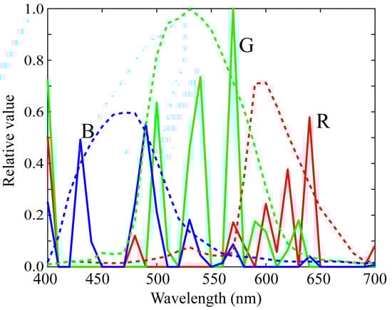 The estimation results obtained using the normal method for the iPhone 8 are shown in Figure 12, where the bold curves in red, green, and blue represent the estimated spectral sensitivities of the red, green, and blue channels, respectively, and the broken curves represent the measured spectral sensitivities. A non-negative least squares estimation was applied to solve Equation (14). Despite the use of many color samples, the estimation results based on the direct use of color samples were quite unstable and inaccurate.