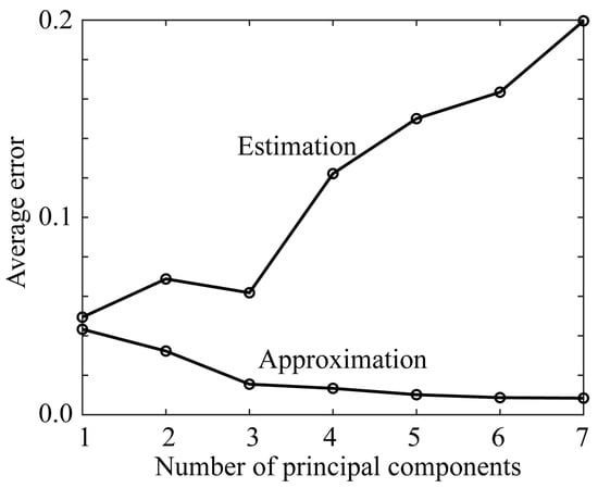 where are singular values (see Equation (9)). Therefore, the approximation error monotonically decreases as the component number K increases. However, the behavior of the estimation accuracy is not necessarily the same. The larger the component number, the smaller the singular values and the lower the contribution rate. In such a situation, when a component with a small contribution that is regarded as noise is added to the estimation process, the estimation accuracy deteriorates extremely. Figure 17 shows the variations in the estimation and approximation errors as a function of the principal components. The error values are averaged over the four mobile phone cameras in Table 3. The minimum average estimation error is recorded when only one principal component is used, and the second smallest error is realized when three principal components are used. As the contribution rate of the first principal component is very large as P (1) > 0.99, and in contrast the contribution of the third principal component is significantly smaller, the estimation using only the first principal component can be considered stable and reliable.