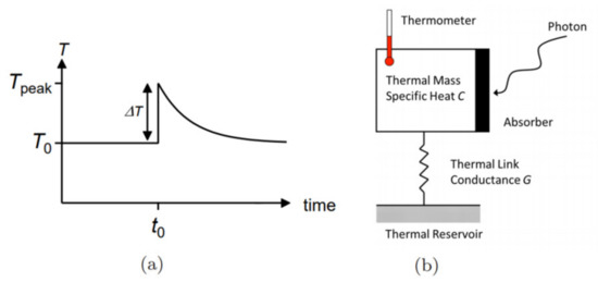 (a) The temperature response T (t) for a calorimeter. (b) Schematic illustration of bolometer working principle in a graphene detector, C (heat capacity) and the thermometer function are provided by the electron subsystem. G (thermal conductance) is provided by the coupling to the contacts and substrate as well as emitted Johnson noise. Reprinted with permission from ref. [56]. Copyright 2021 Copyright Clearance Center.