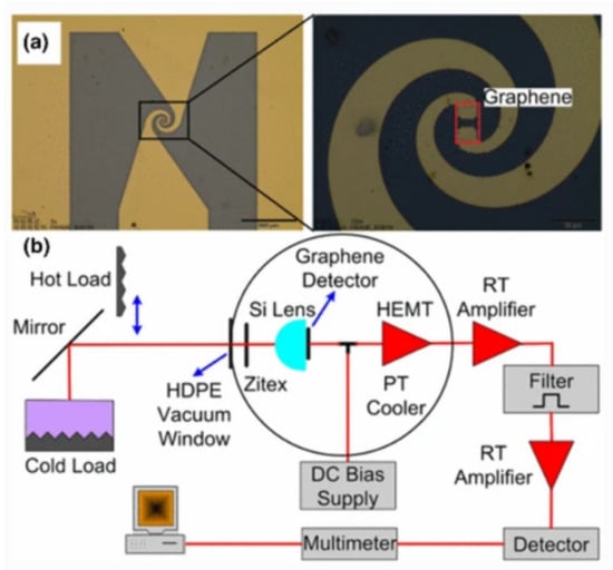 Miao et al. [66] reported a graphene-based thermal noise readout bolometer. The detector is composed of graphene and a THz spiral metal antenna. The bolometer is a graphene micro-bridge connected to the logarithmic spiral antenna through Au contact. The detector had a THz response with the band range from 0.3 to 1.6 THz, and the NEP is at a temperature of 3 K. Figure 3a shows the structure, and Figure 3b is the system test diagram of the detector. In order to understand the heat transfer of graphene microbridges, they measured three kinds of microbridge length (from 0.6 to 8 μm) and measure the detectors at different temperatures. The results illustrate that the length of the graphene microbridge has little influence on the NEP, but it is largely affected by the heat diffusion of the contact pad because of the electron diffusion. Using superconducting contact pads can improve the performance of the bolometer.
