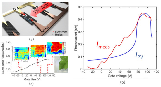 The photodetector usually combines the effect of the PV and the PTE, but their role during the detection can be far different [71,72]. Degl et al. [73] reported a THz detector with a graphene coupled antenna which is based on the photovoltaic effect. In order to improve the responsiveness and coupling of incident light to the detector, they used two different metals to make an antenna array. As illustrated in Figure 4a, one side of the antenna is built of Ti/Au to achieve n-type doping in nearby graphene, while the other is made of Pd/Au to achieve p-type doping. As a result of the photovoltaic effect, they built an electric field at a metal–graphene junction, which separates the photo-excited electron-hole pairs. There are multiple changes in the direction of the photocurrent generated by PTE in graphene because the Fermi energy is varied along the Dirac cone. The photocurrent in different back-gate voltages cannot be reversed, as shown in Figure 4b, which suggests that the photovoltaic effect dominates the detector. They also integrate the detector into the imaging system and receive THz imaging of fresh leaves, as shown in Figure 4c.