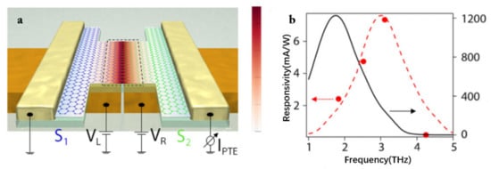 - Cai, X.; Sushkov, A.B.; Suess, R.J.; Jadidi, M.M.; Jenkins, G.S.; Nyakiti, L.O.; Myers-Ward, R.L.; Li, S.; Yan, J.; Gaskill, D.K.; et al. Sensitive room-temperature terahertz detection via the photothermoelectric effect in graphene. Nat. Nanotechnol. 2014, 9, 814–819. [Google Scholar] [CrossRef]
