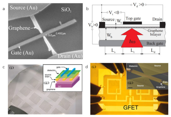 (a) The SEM image of a graphene device. Reprinted with permission from ref. [94]. Copyright 2021 Copyright Clearance Center. (b) Schematic view of a graphene terahertz radiation detector. Reprinted with permission from ref. [95]. Copyright 2021 American Physical Society. (c) (i) Image of devices fabricated on a 2-inch graphene wafer, (ii) the schematic cross-sectional view of a top-gated graphene FET. Reprinted with permission from ref. [96]. Copyright 2021 Copyright Clearance Center. (d) (i) Scanning electron image of a top-gated, dual-channel graphene transistor used in the mixer IC. (ii) Optical image of a completed graphene mixer. Reprinted with permission from ref. [97]. Copyright 2021 Copyright Clearance Center.