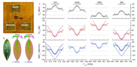 Qin et al. [101] reported a GFET based on a self-mixing mechanism. The source and drain contacts to the bilayer graphene channel are two dipole antennas, as shown in Figure 8a, and the field-effect gate is located in the gap between the source and drain antennas. The THz electromagnetic wave is fed to the grid through the gate antenna, and a strong local terahertz field is induced in the graphene channel near the grid channel of the gate facing the drain antenna. The NEP of direct detection of 216 GHz and 648 GHz is and , respectively. The local oscillator of 2nd harmonic (432 GHz) and 3rd harmonic (648 GHz) mixing detection of 216 GHz, and its NEP is and , respectively, mixing loss is 38.4 dB and 57.9 dB, respectively. They scanned fresh leaves at different frequencies, and the results are shown in Figure 8b. Through self-mixing detection at 216 GHz, 432 GHz, and 650 GHz happened, the response characteristics of the detector are proved to meet with the design.