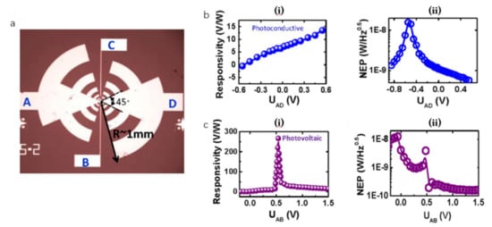 The plasmonic wave detection requires the asymmetrical coupling of source and drain. The non-linear rectification of the carrier transmission is a direct detection, and the detection by the PTE is realized by asymmetric contact [100]. Liu et al. [103] introduced a symmetrical pair of fingers in a graphene detector based on antenna coupling, as shown in Figure 9a. There are four terminals in the detector, which can switch the light detection mode by controlling different contact configurations in the graphene channel. The function of the photocurrent can be calculated by comparing the shape of the photocurrent curve. More interestingly, the decreasing in the length of the channel or increasing the dipole interaction between the two opposite antenna arms can efficiently enhance the performance of the detector. However, by the bias field effect, the maximum voltage response of the device reaches 280 . The performance of the detector is different under different working modes. As shown in Figure 9b, the NEP of the device in photovoltaic mode is , and the responsivity is 100. When the device works in light guide mode, the performance of the device is reduced, as shown in Figure 9b. The NEP is about , and the responsivity is about 10 . There is a mismatch between the result and the theoretical result, which may be due to the super-large antenna used and the long channel have a remarkable effect on detector efficiency. It is possible that optimizing the antenna would further enhance the performance of the THz detector.