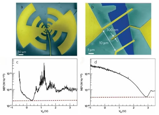Vicarelli et al. [122] used single-layer and bilayer graphene prepared by mechanical exfoliation to fabricate an antenna-coupled graphene FET. The coupled antenna is a log-periodic antenna, as shown in Figure 10a, and the channel length is demonstrated in Figure 10b, which is a low parallel capacitance antenna that leads to ensure the selectivity of the spatial mode and the polarization of the incident radiation. Furthermore, the antenna can also ensure the asymmetry of the source and drain. The plasma wave excited in the channel of the FET realizes the detection of 0.3 THz at room temperature. As shown in Figure 10b,c, the NEP and responsivity of the single-layer graphene detector are and 0.1 V/W, and the NEP and responsivity of the bilayer graphene detector are and 0.15 V/W, respectively.