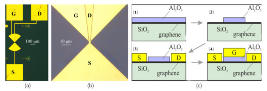 (a,b) The optical microscope image of the fabricated GFET detector (S, G, and D—source, gate, and drain, respectively) and the image of the GFET detector in the center of the antenna. (c) Schematic illustration of the fabrication steps of the graphene FET detector. (1) The graphene layer was covered by a thin Al seed layer and followed by natural oxidation; then, an Al2O3 gate dielectric was grown on top of the seed layer by atomic layer deposition. (2) The Al2O3 was patterned and etched with a buffered oxide etch. (3) The source and drain contacts were fabricated by evaporating. (4) The gate electrode was evaporated and patterned on top of the patterned Al2O3 layer. Reprinted with permission from ref. [135]. Copyright 2021 Copyright Clearance Center.