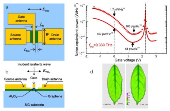 Qin et al. [140] fabricated an FET based on bilayer graphene. A 2-inch 4H-SiC (0001) graphene wafer was used as substrate-grown monolayer graphene at a high temperature of 1550 °C in an argon atmosphere. Then, they annealed the monolayer epitaxial graphene in molecular hydrogen at 900 °C to obtain the bilayer graphene. The structure of the detector is shown in Figure 12a,b. The detector has a voltage responsivity of 30 V/W and a NEP of at the 0.33 THz. Transmission-type THz imaging of a fresh leaf was studied by using the GFET detector with the gate floating as a proof-of-concept experiment on a two-terminal detector. As shown in Figure 12d, a GFET detector with a floating gate was used to study the transmission-type THz imaging of fresh leaves.