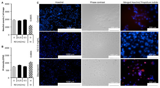 Nuclei counts showed no decrease in response to ND either at 0.25 or 0.5 mg/mL compared to control (Figure 1A). The cell death inducer staurosporine, used as a positive control, resulted in a significant decrease in nuclei number. Dead or damaged cells were identifed using the PI. ND did not increase dead or damaged cells in opposite to staurosporine (Figure 1B). In Figure 1C, left panel shows Hoechst labeling of nuclei, central panel is the phase contrast images and left panel corresponds to merged Hoechst (blue) and PI (red).