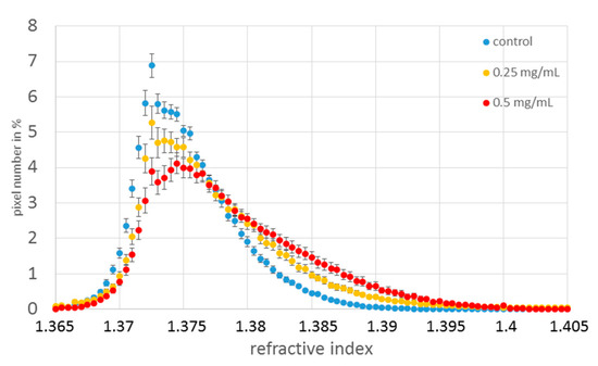 When incubated in the presence of nanoparticles, the frequency of some refractive indices increased in comparison to those observed in the control cells. That is true for the highest values of RI, (RI > 1.39) (Figure 2). It allowed the identification of cells exposed to nanoparticles. One of the most interesting characterizations of the refractive index is that it does not require labeled NPs. With nanoparticles being too small to be directly observed, it is nevertheless possible to observe their intracellular accumulation. Based on the number of pixels for each refractive index per cell, it is possible to localize NPs inside cells. Moreover, the spreading of NPs inside cells without any accumulation sites cannot be excluded. Although accumulation most likely represents the majority of NPs taken up by cells, it cannot be excluded that NPs might also induce structural changes that may modify the refractive indices within cells. Nevertheless, one may expect that such changes of the RI would remain within the range of the RI of biological values.