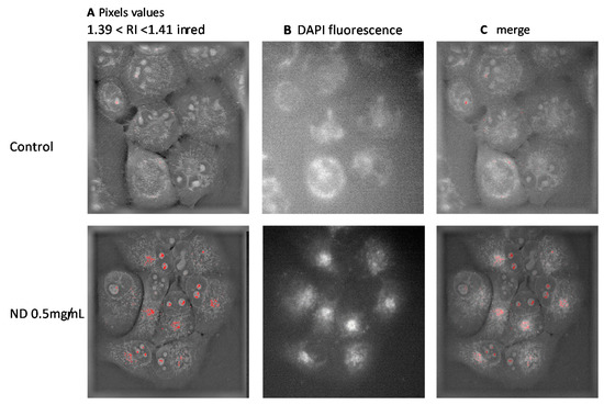 Knowing the effect of NDs on RI values (Figure 2), the location of nanodiamonds corresponds to the pixels with the highest values. It was then possible to localize them. Since NDs are fluorescent, it was then also possible to localize them directly inside the cells. The comparison of the RI values shifted, and the fluorescence shows a perfect match, demonstrating that the increased RI values correspond to the place where the fluorescence is located, proving that NDs are present inside the cells. Nanodiamonds are localized inside the cytosol around the Golgi apparatus. (Figure 3C). It cannot be excluded that the RI values of some intracellular components may be the same RI values as those of the nanodiamonds. This is the case of chromatin which may reach RI values higher than 1.39. In the present case, NDs did not penetrate the nucleus, since they are not fluorescent (Figure 3C).