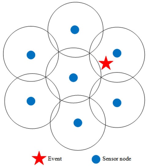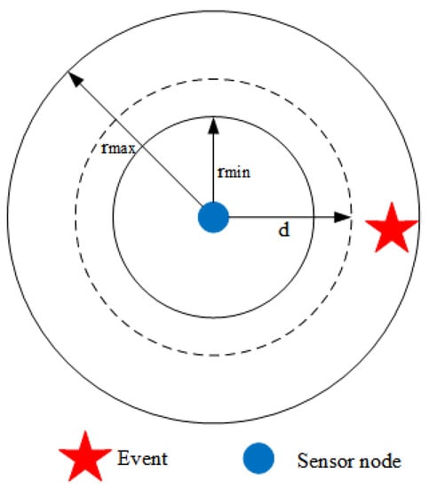 We assume the events occur randomly and independently in M, subject to a Poisson process of Poisson rate . The Poisson process is a stochastic process used to model random and independent events. Furthermore, it is assumed that the measurement is efficient, which means all the events occurring within the sensing range will be expediently detected. Therefore, the probability that q events processed by a sensor with sensing radius r in duration t is