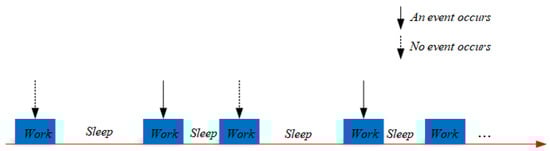 Figure 2 shows a schematic diagram of a typical alternate sensing scheduling scheme. A sensor wakes up its sensing unit when transitioning to the working state and turns it off when the sleep interval comes, and the length of the sleep interval is dynamically adjusted according to the event occurrence of the previous interval. Despite the scheme’s prevalence, how to adjust the intervals properly is as yet an open issue.
