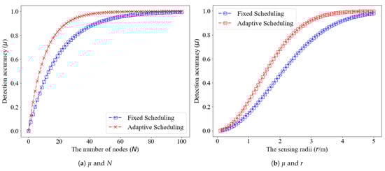 Detection accuracy for the proposed adaptive scheduling and fixed scheduling (a) against the number of cognitive sensors N (r is fixed and m); and (b) sensing radius r (N is fixed and ).