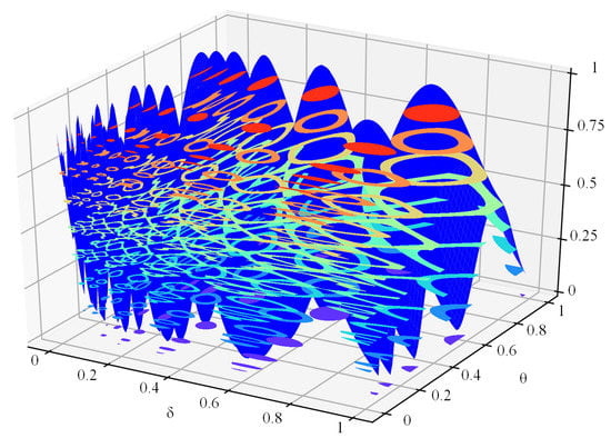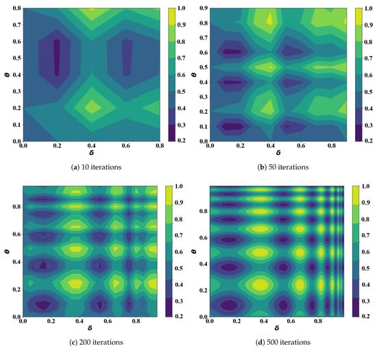 Figure 14 shows the optimization process of the FTO algorithm, and the values of the horizontal and vertical axis represent the values of and , respectively. The darker the color of the contour map, the smaller the value of J. The algorithm stops after 500 iterations, and Figure 15 provides the final comparison of the peak areas. We can see that the peak area in the lower-left corner is the largest, and is where the optimal point is most likely to appear. The central point of the aforementioned area was taken as the ultimate global optimization point with the coordinate pair .