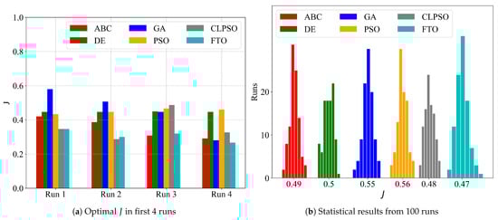 Figure 16a presents the optimal J for the first four runs, applying ABC, DE, GA, PSO, CLPSO and FTO; Figure 16b shows a statistical result from 100 runs. From the perspective of distribution, FTO demonstrates a better optimistic effect than the other algorithms for its lowest center J value .