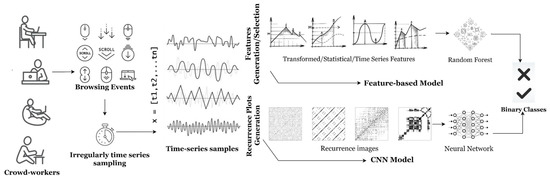 A recent study [34] leveraged from [29,32] to generate richer behavior features investigated the feasibility of using these features of crowd workers for classifying the correctness of labels and predicting the labeling accuracy of workers. They applied a random forest classifier and a k-means clustering classifier for transforming sequence-like features. Next, they combined the random forest classifier with a co-training supervised naïve Bayes model for the sequence features. Lastly, some crowdsourcing quality research has focused on the consistency behavior of crowd workers, such [44,45]. Different from the aforementioned studies, the present study aimed to enrich the research by manipulating data as time-series data. This new angle of data manipulation will create opportunities for enhancing the performance of machine learning (ML) models, either by feeding ML models with spacious features as in our feature-based model or by leveraging deep learning models as in our second image-convolutional neural network (image-CNN) model.
