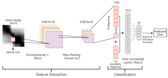 Therefore, the output dimension =. This was put into the pooling layer. In the MaxPooling2D layer in Keras, the default stride equals the pooling size, and our pooling size was ; thus, = 2. Using Equation (13) again,. Consequently, the pooling output dimension =, and we had 32 filters, so the number of features was = 7200. These features, concatenated with 11 auxiliary features, give the total number of features—7211. This means that in Equation (13) has dimensions of , namely the features multiplied by the number of neurons of the fully connected layer. The last sigmoid layer produces a label of either 0 or 1. The detailed architecture of this model is presented in Figure 2.