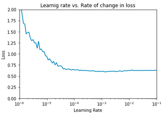 In this subsection, we outline the results of our CNN model using various hyper-parameters. Since the learning rate is one of the most important hyper-parameters to tune for training deep neural networks, we implemented an experiment to select the most suitable learning rate. We fixed the number of epochs to 300 and the dropout rate for the convolutional layer and dense layer to 0.5 and 0.25, respectively; consequently, the batch size was set to 50. Leveraging from [56], we set the learning rate range as base_lr = 0.1 and max_lr = . We started from a low learning rate and increased it exponentially for every batch using the step size, which we set to step_size = 20.