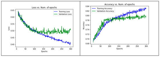 As Figure 3 shows, there was a continuous decrease until reaching a stable state. The point of stability estimates the most suitable learning rate. We approximated it as . We fixed this learning rate for all subsequent hyper-parameters experiments. Regarding the number of epochs, we experimented with the training/validation loss and accuracy against 300 epochs, as shown in Figure 4. We found that at approximately 150 epochs, the validation accuracy and loss started to be fixed. This meant that the model started to be stable around 150 epochs and it seemed to enter in overfitting just after that. Therefore, we fixed the number of epochs to 150 for the following experiments.