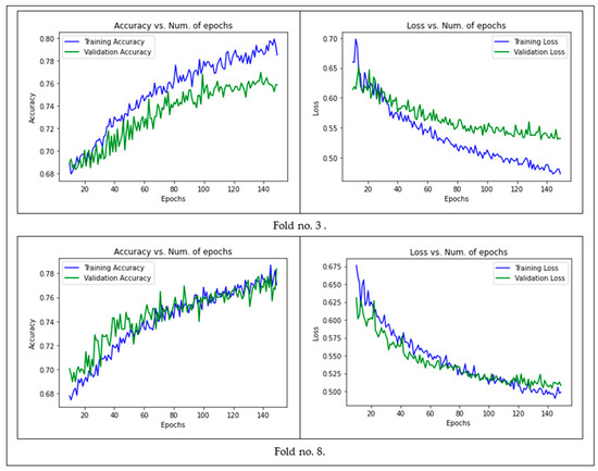 First, we used batch sizes of 25, 50, and 75 and found that the optimal validation accuracy and loss were achieved with a batch size of 50. Second, for the convolutional layer, we used dropout rates of 0.25, 0.50, and 0.75. We noticed that the model attained the optimal validation accuracy and loss with the 0.25 dropout rate. The same was found with the fully connected layer where the 0.25 dropout rate achieved the best results. Finally, we tried some different dimensions for the images, namely 56 × 56, 28 × 28, and 32 × 32, as recommended in [57]. Regarding the training, validation loss, and accuracy across the epochs, since we conducted a k-folding experiment with k = 10, we only present two folds (the third and eighth epochs) in Figure 5.
