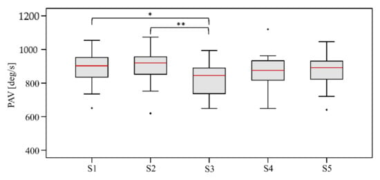 In mean, 451.2 ± 20.2 strides were analyzed for all shoe conditions. The analysis of PAV revealed the lowest value for S3, with a median of 845.6 deg/s (648.9–993.7 deg/s), and the highest value for S2, with a median of 919.5 deg/s (619.7–1073.1 deg/s). The ANOVA showed a significant main effect (p < 0.001) for PAV between the five different shoe conditions. The Bonferroni post-hoc test revealed a significant difference between S1 and S3 (p = 0.014), and a highly significant difference between S2 and S3 (p = 0.008) (Figure 2). Cohen’s d showed large effects (d ≥ 0.8) for both significant pairwise comparisons.