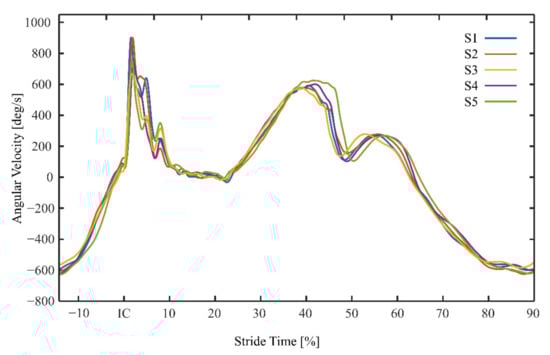 Data from the sensors were analyzed in post-processing using MATLAB R2020a (MathWorksTM, Natick, MA, USA). To separate the strides in continuous data, the accelerometer signal of the IMU (vertical axis) was 80 Hz zero-lag Butterworth high pass filtered and the first peak in the filtered signal was defined as the initial ground contact of the foot (IC) [,]. Furthermore, a zero-lag Butterworth low-pass filter was applied to the gyroscope data (4th order at 50 Hz) to remove noise. A previous study showed that a gyroscope can be used to precisely determine the maximum angular velocity in the frontal plane, which represents the peak eversion velocity []. We transferred these results to this study and assumed that the angular velocity in the sagittal plane can be used to investigate the rollover. Therefore, the maximum angular velocity in the sagittal plane of the foot was analyzed and the peak angular velocity (PAV) was extracted within 200 ms after IC. To eliminate the positive and negative acceleration at the beginning and the end of each trial, the first and last ten steps of each file were removed in the analysis.